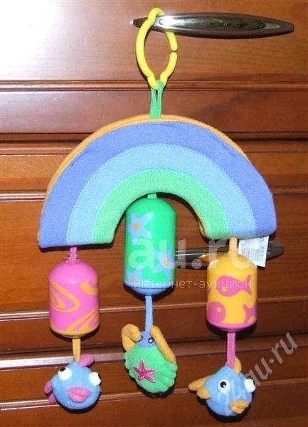 Для малышей от 0 месяцев. К мягкой радуге на 3 пластиковых цилиндрах подвешены 3 мягких погремушки (2 рыбки и 1 крабик). Даже при легком прикосновении к игрушкам или нежном дуновении ветерка, цилиндры издают мелодичный звон, как ветряные колокольчики, привлекая внимание ребенка.