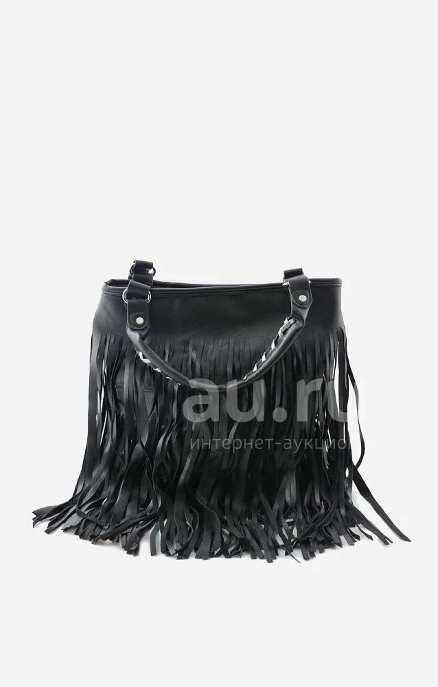 Стильная сумка выполнена из прессованной кожи черного цвета. Модель украшена длинной бахромой. Детали: застежка-молния, две ручки с декоративным плетением.