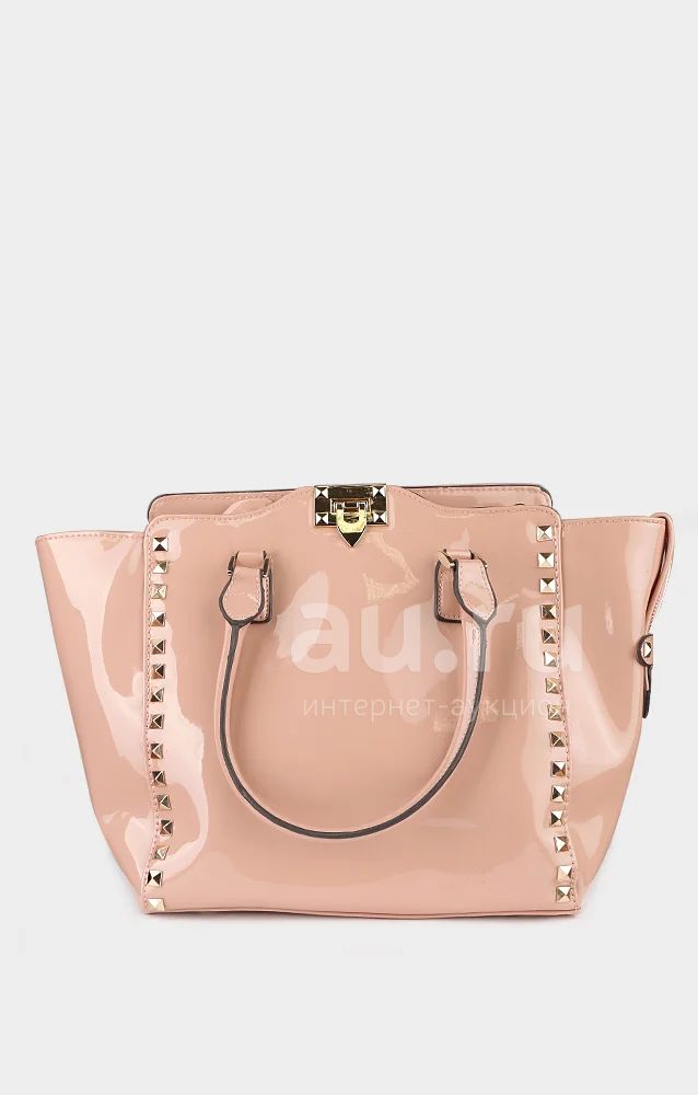 Вместительная сумка светло-розового цвета, украшенная декоративными кнопками. Модель выполнена из лакированной кожи. Детали: две удобные ручки, клапан на замке.