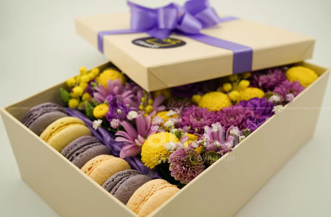 FlowerBox с макарунами (гербера, хризантема, гипсофила, мимоза, гвоздика)