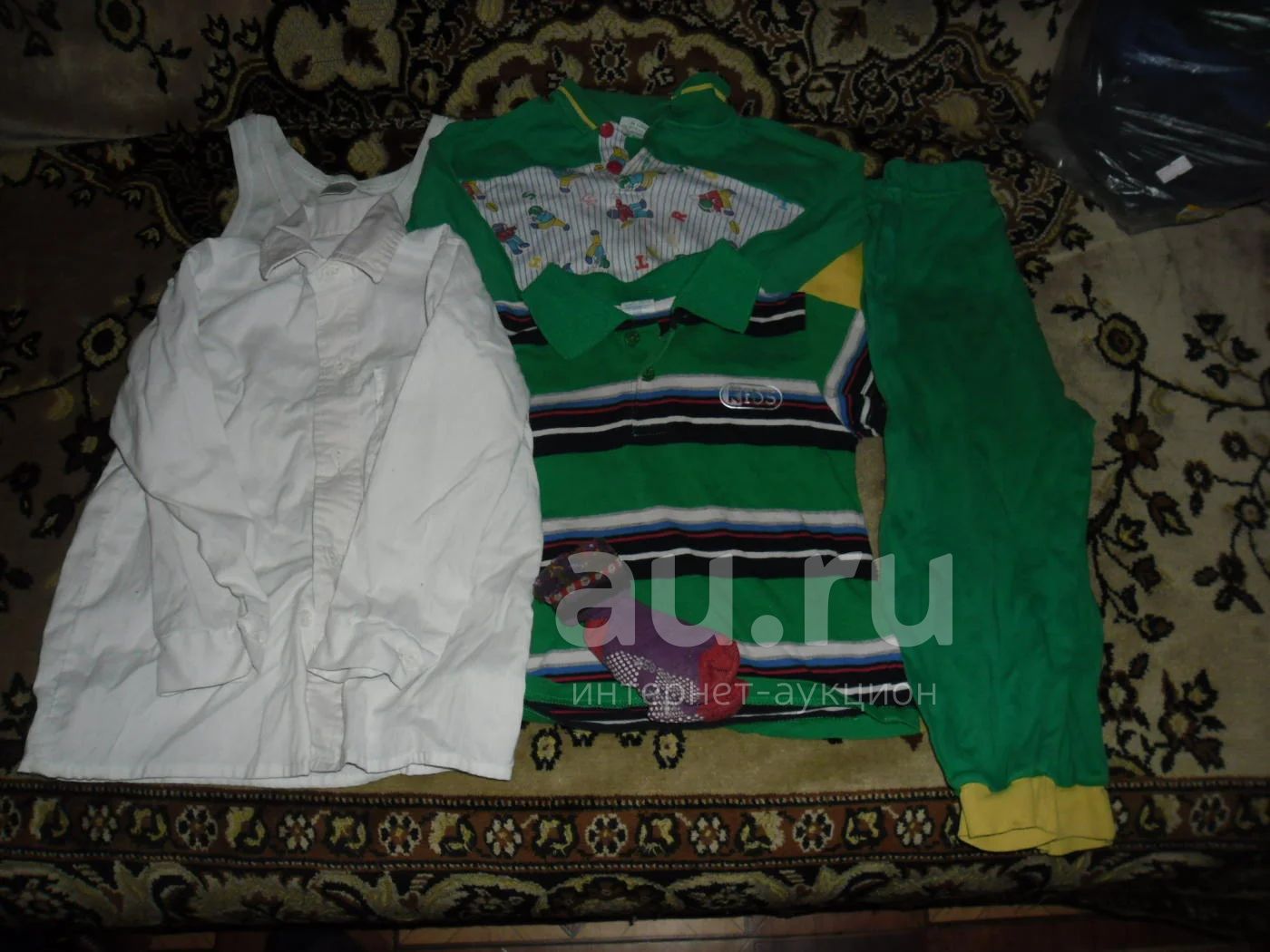 Белая рубашка,футболка в хорошем состоянии,домашний костюм(штанишки и кофточка) и майка с пятнышками.носочки целые.