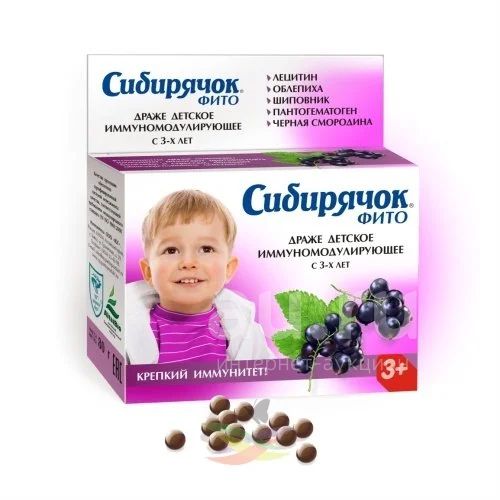 Драже детское «Сибирячок» фито рекомендуется в качестве диетического профилактического продукта для детей от 3-х лет, оказывающего иммуномодулирующее действие, дополнительного источника витамина С.