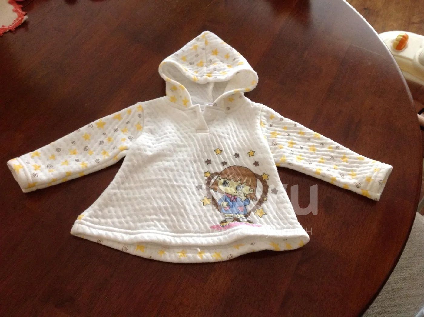 Кофточка с капюшоном, рисунок девочка, звездочки, ткань двойной стеганный трикотаж футер- натуральная хлопчатобумажная ткань, гладкая с внешней стороны, мягкая и нежная - с внутренней, благодаря чему является удивительно комфортной и экологически безопасной для нежной кожи малыша.