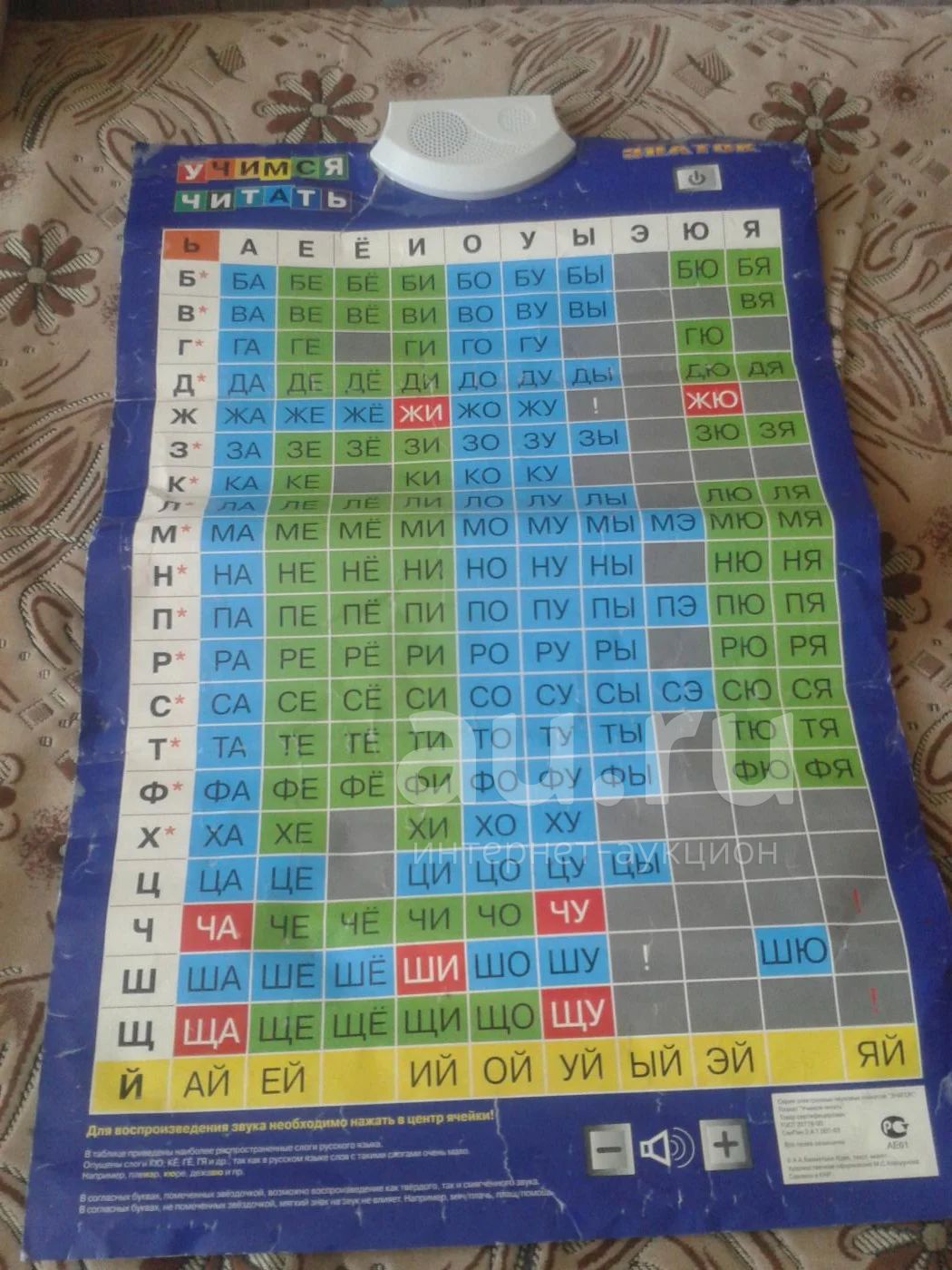 Если нажать кнопку "ь" (мягкий знак) и с ней - согласный звук со звездочкой, звучит мягкий звук: "л" + "ь" = "ль". Если же у звука нет мягкого варианта, говорящий плакат подаст сигнал. Красным обозначены слоги-исключения - "жи", "ши", "ча" и др. Плакат даже знает и может рассказать малышу простейшие правила русского языка, связанные с этими исключениями. Нет в плакате нескольких слогов, которые встречаются очень редко и в заимствованных словах - "кю", "вю", "нэ".