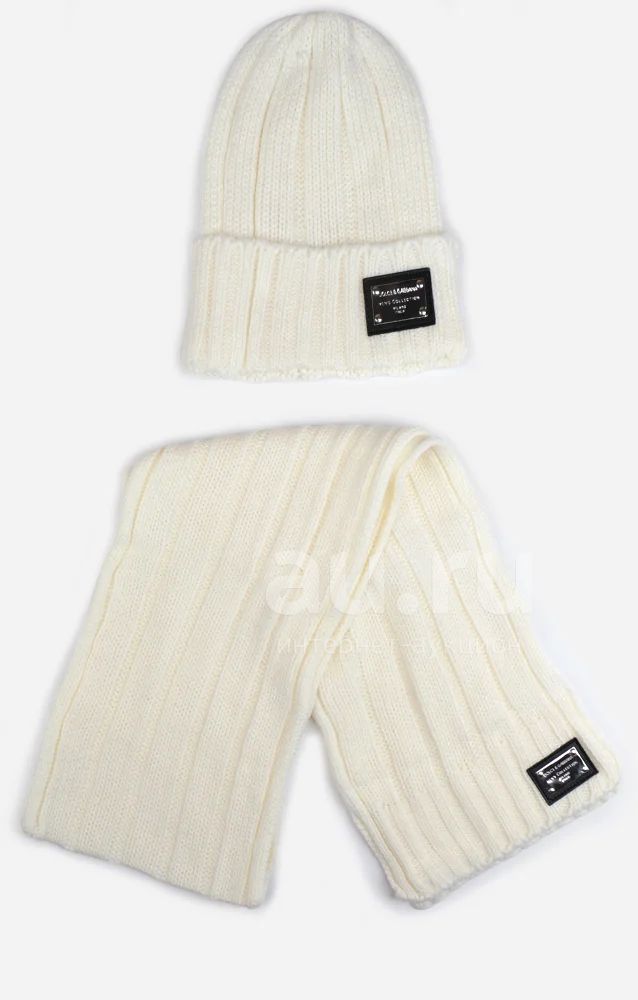 Комплект ( Шапка и шарф) белого цвета. Детали: фактурная вязка, широкий отворот, фирменная металлическая нашивка.