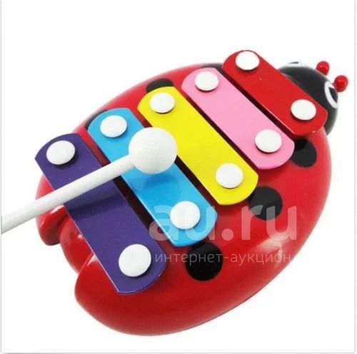 Ксилофон- одна из первых музыкальных игрушек малышей. Яркий ксилофон в форме букашки непременно заинтересует ребенка. Имеет 5 разноцветных пластин из металла, воспроизводимый звук звонкий, но слух не режет. Основание- пластик (довольно прочный). Размер игрушки 16*12 см. Палочка 18 см. Идет в упаковке. (упаковка немного повредилась при транспортировке)