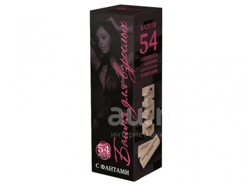 Башня с заданиями для взрослых - 54 бруска с заданиями. Задания в настольной алкогольной игре разные: кого меньше тот и пьет; бармен следи, чтобы у всех было налито; каждый называет свою любимую музыкальную группу и многие другие.
