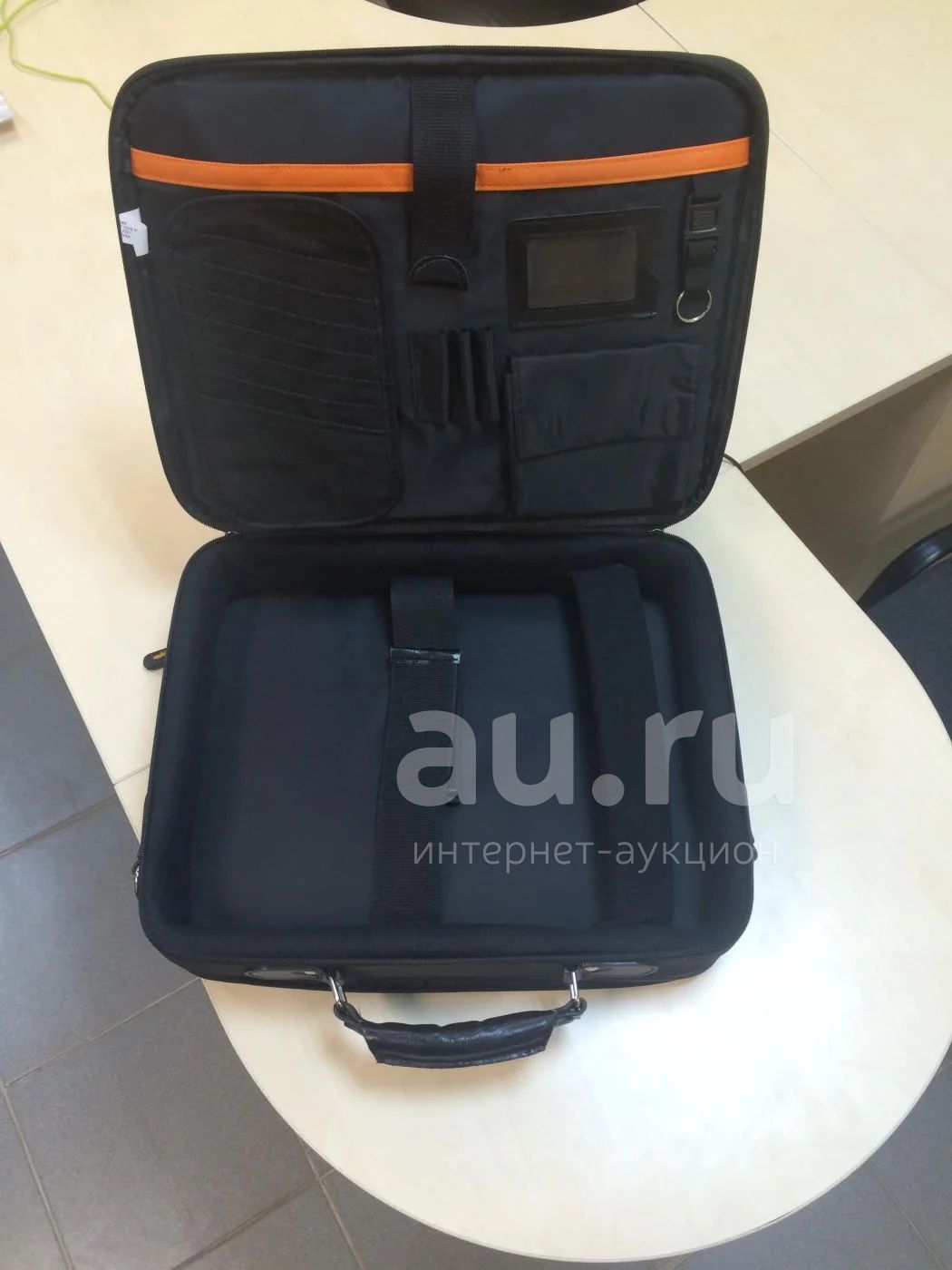 Описание сумки: сумка для ноутбука с максимальной диагональю матрицы 15,4 дюймов с оранжевыми швами из высокопрочного нейлона со вставками из искусственной кожи.