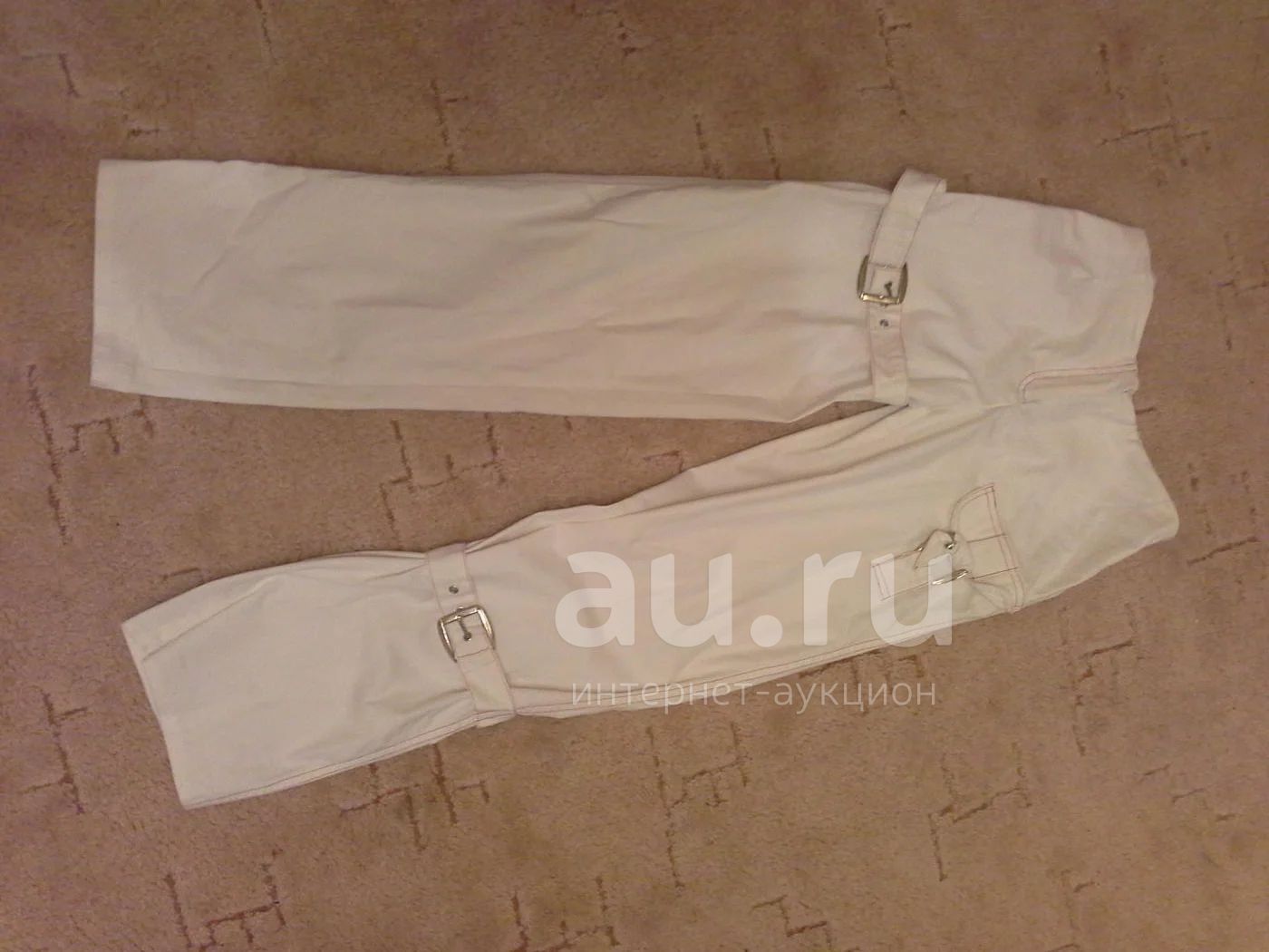 Брюки шиты на заказ.ткань белая,плотная,типа хлопка.строчки выполнены красной ниткой.талия примерно 75 см.длина штанины по внутреннему краю-83см,по внешнему-104см.пряжки лучше заменить,плохо держат.размер примерный