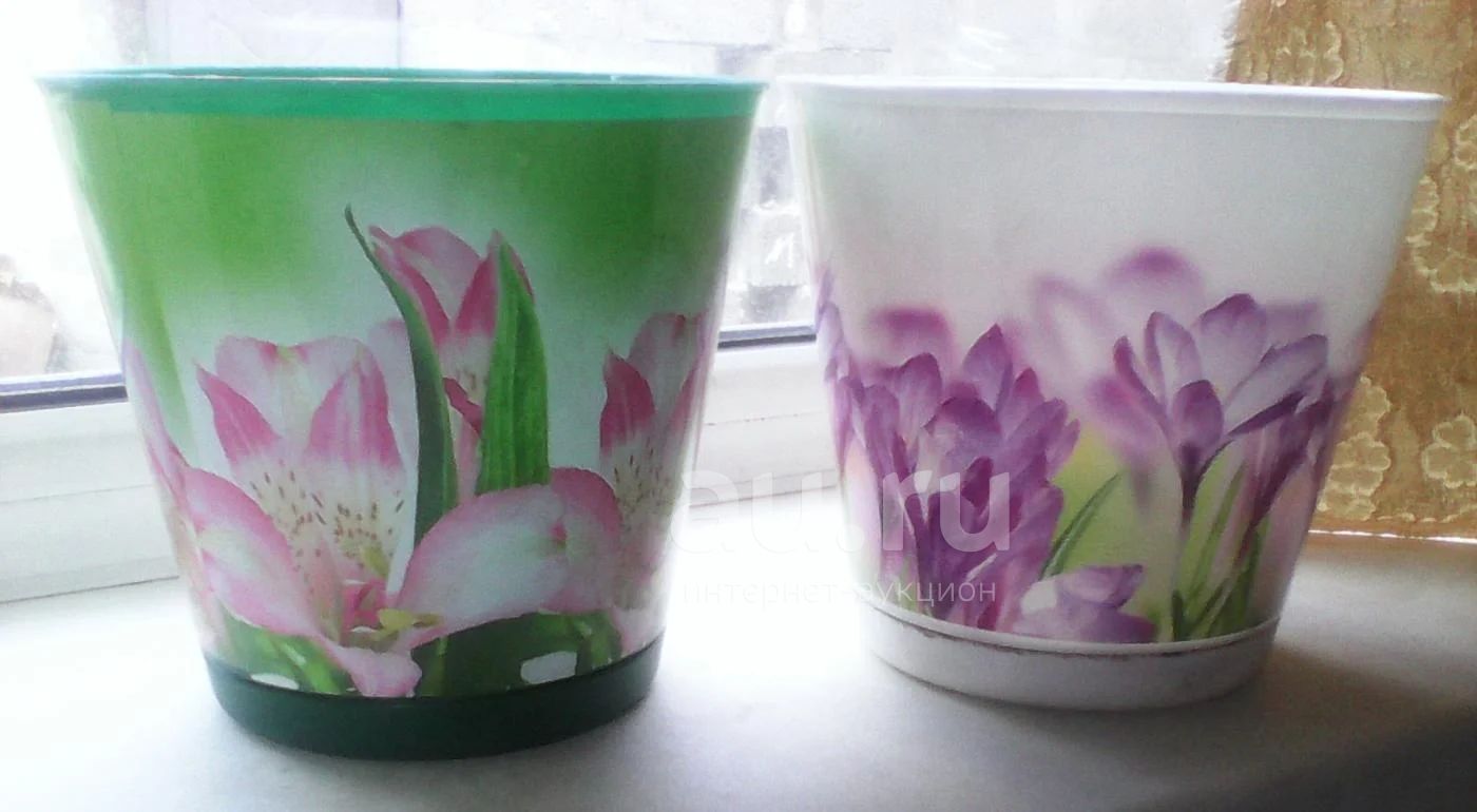 Б/у. Высота 11 см. Диаметр по верху 12 см. С системой прикорневого полива. Красивые - но цветы, увы, не дружат со мной!((