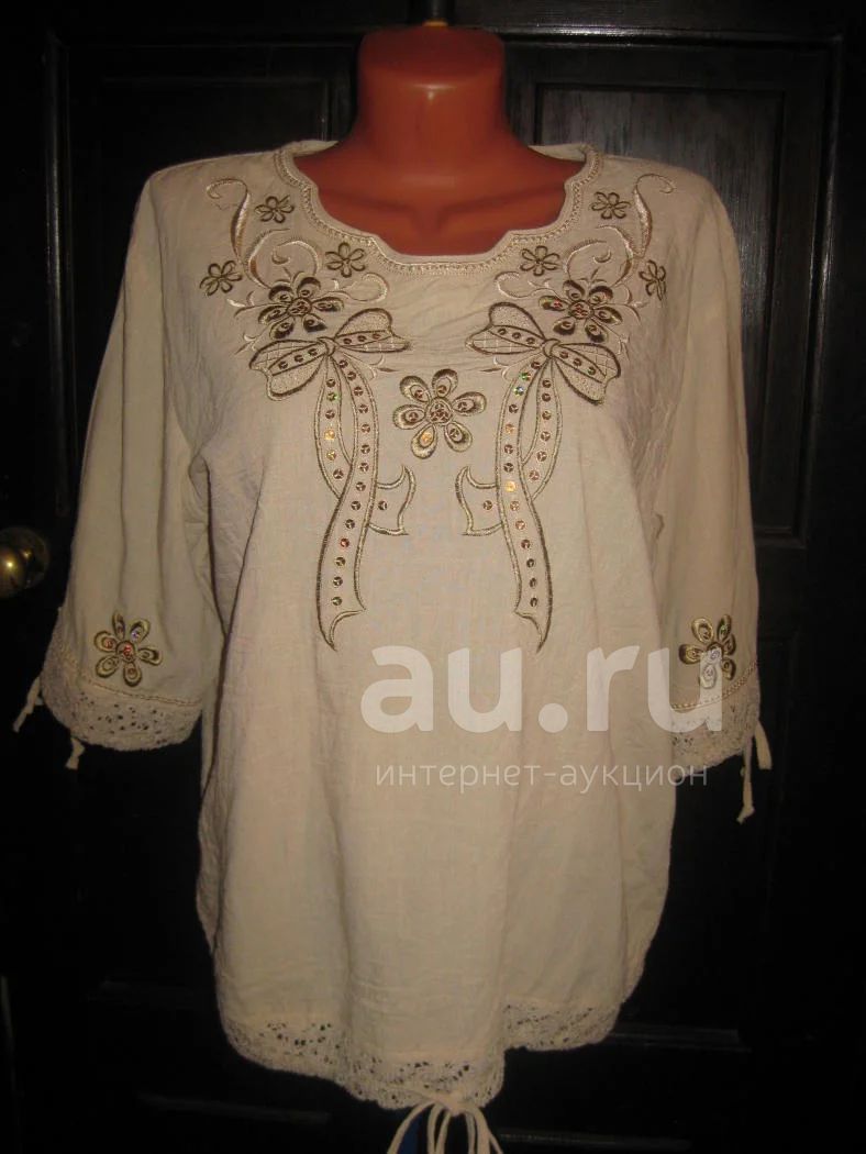Очень хорошенькая блузка 48- 52 рост 160 см, плотная марлевка бежевого цвета. Красивая машинная вышивка атласными нитками с цветными паетками. Рукава и низ блузки отделаны кружевным полотном х/б внутри которого проходит кулиска. Отлично смотрится как с джинсами так и с юбкой. Состояние новой блузки. В моих лотах много блузок, юбок, брюк, купальников, трикотажа, детской одежды -- приглашаю посмотреть