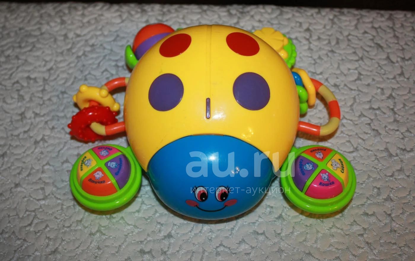 Жук поет задорную песню при нажатии сверху. Ни один малыш не удержался от танца под нее. Сзади есть гремелки и крутилки. Две кнопочки по бокам имитируют животных по типа "кошка - мяу". Единственное что не работает - это колесики снизу, т.е. он должен двигаться по полу, у нас не двигается. Колеса были специально вынуты и в последствии утеряны.