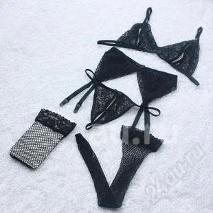 Кружевной сексуальный комплект состоящий из 4-х предметов: бюстик, трусики-стринг с разрезом, чулки и пояс для них с пажами. Размер 42-44.