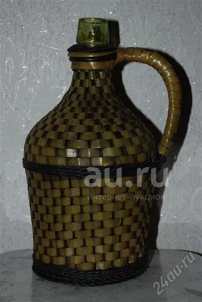 Бутыль литра на три!Оплетен плетенкой и смотрится оригинально.В таких раньше самогон и настойки разные хранили.