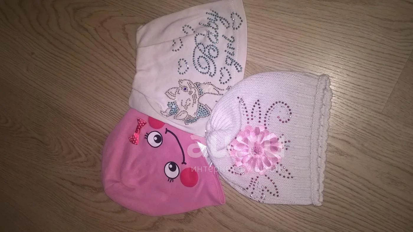 Шапочки на девочку. Состояние хорошее. Цена за одну шт. Много других лотов на рост от 80 до 98. Возможна продажа всех лотов одним. Цена за все 2000р.