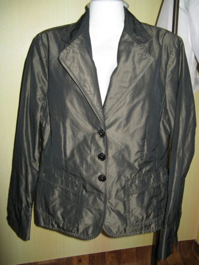 темно-серого цвета, воротник и карманы отделаны кантом кремового цвета, кремовая строчка . на подкладе