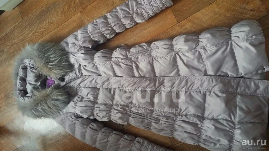 пуховик с капюшоном и ремнем в отличном состоянии, мех натуральный, размер 46, цвет бледно-лиловый