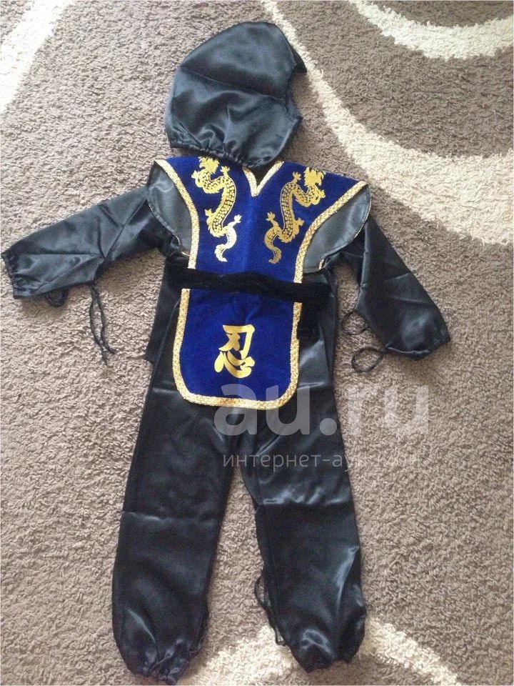 Костюм Ниндзя синий р.110. Состояние идеальное, одевали один раз. Куртка, брюки, накидка с поясом, шапка. Длина брюк 65см, длина кофты 41см, длина рукава по внутреннему шву 32см.