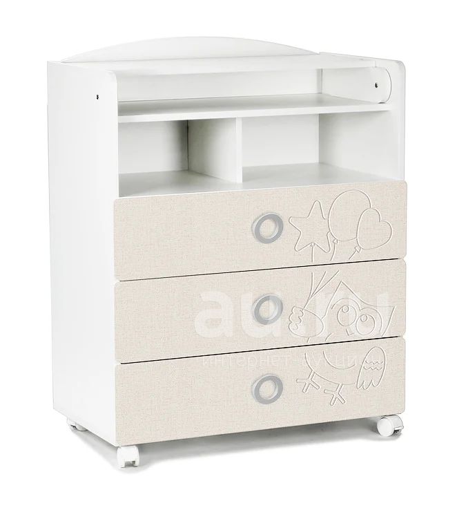 Комод ЛДСП Сова 700031-212 бел+серый текст (1 полка, ручка-круглая,колеса, 3ящ) Код153208 Доставка fr