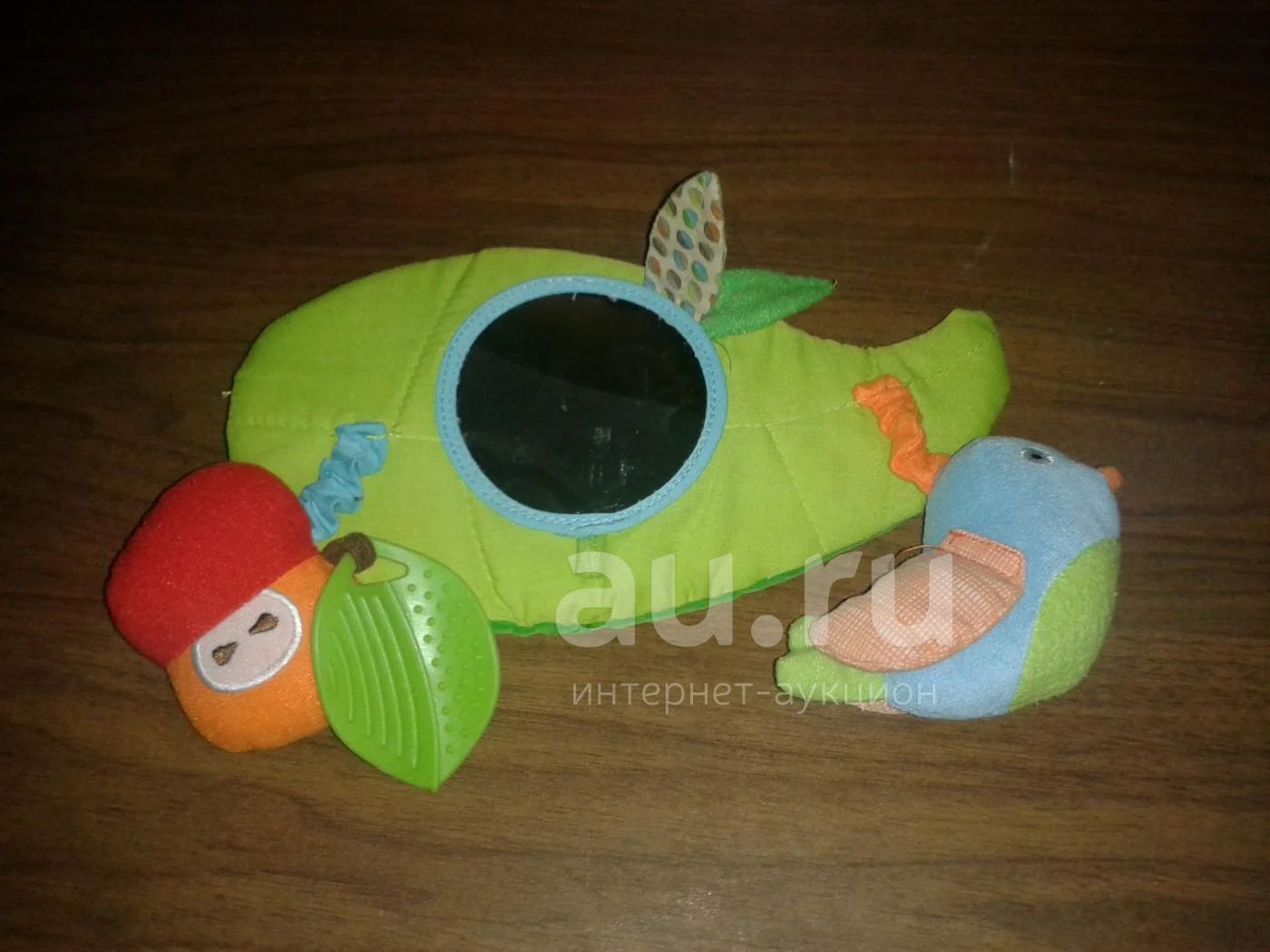 Имеется зеркало, шуршащий листик, погремушка, прорезыватель, птичка с пищалкой. С обратной стороны ленточки с липучкой. размер 25*13,5см.