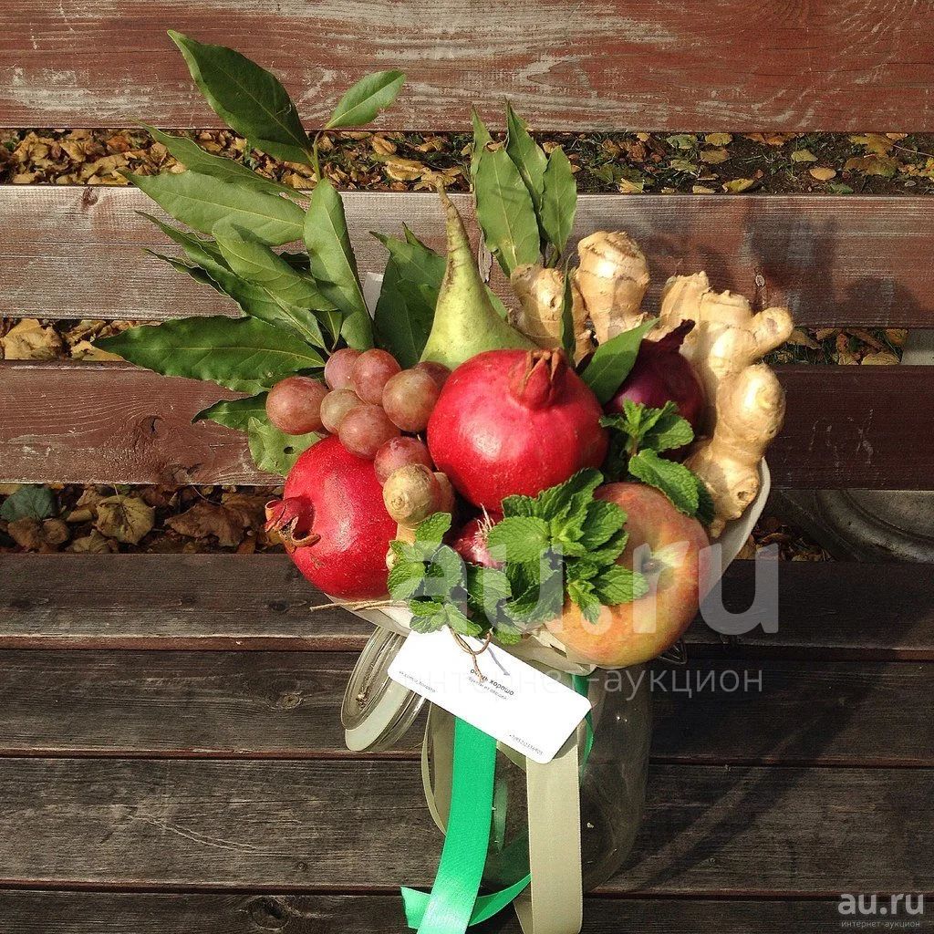 Антипростудный букет с имбирем, гранатами, тимьяном, редькой, виноградом, яблоками и красным луком.