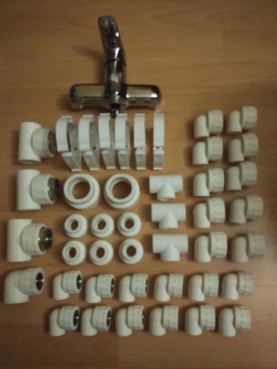 Требуется собрать конструкцию как на фото (в двух экземплярах - для холодной и горячей воды): все фитинги и прочие запчасти в одну целую конструкцию.