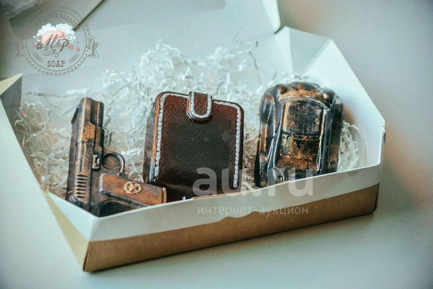 Набор мыла "Пистолет, портмоне, машинка". Мыло изготовлено из качественной мыльной основы с добавлением ухаживающих масел, ароматизировано стойкими мужскими ароматами производства США. Упаковано в эко-коробку.