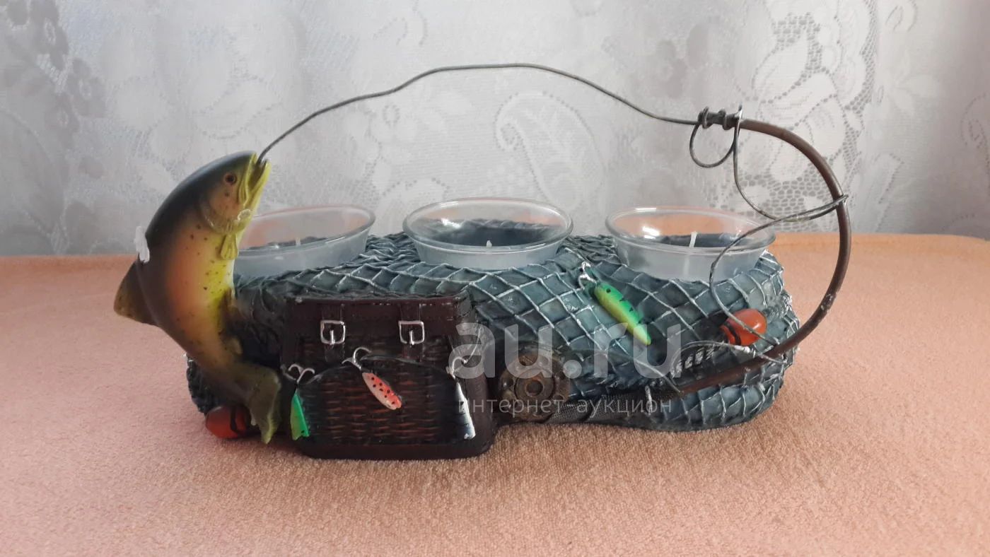 Оригинальный стилизованный подсвечник для любителей рыбалки! В комплект входят три свечки в стеклянных стаканчиках.