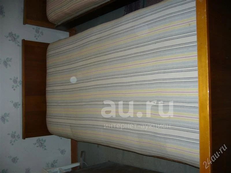 Кровать с синим матрацем. Кровать состоит из каркаса и матраца. Матрац пружинный, цельный.