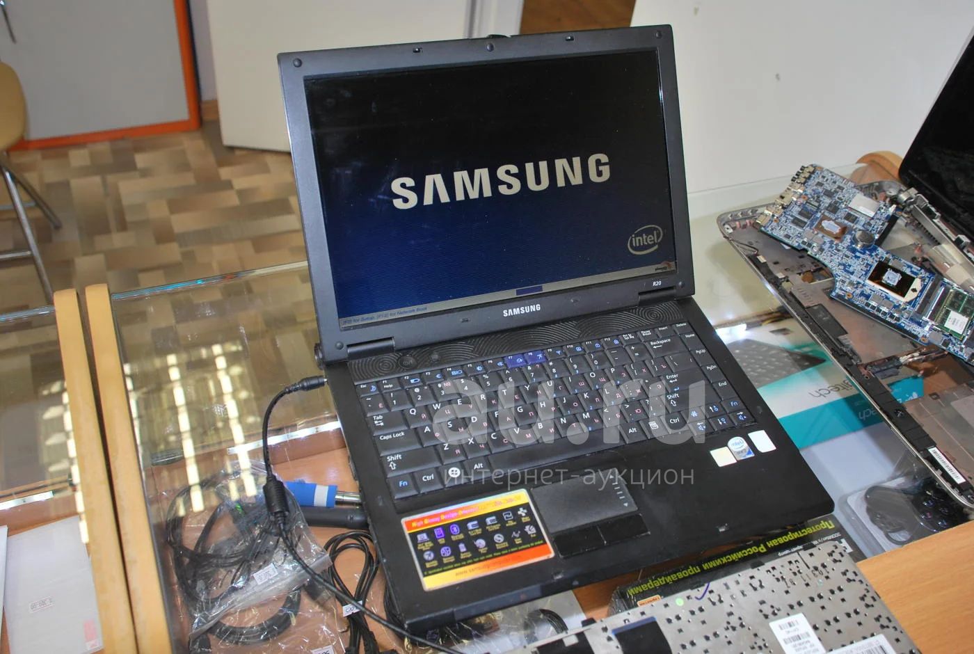 Включается и висит на заставке, в комплекте ноутбук и зарядное устройство.