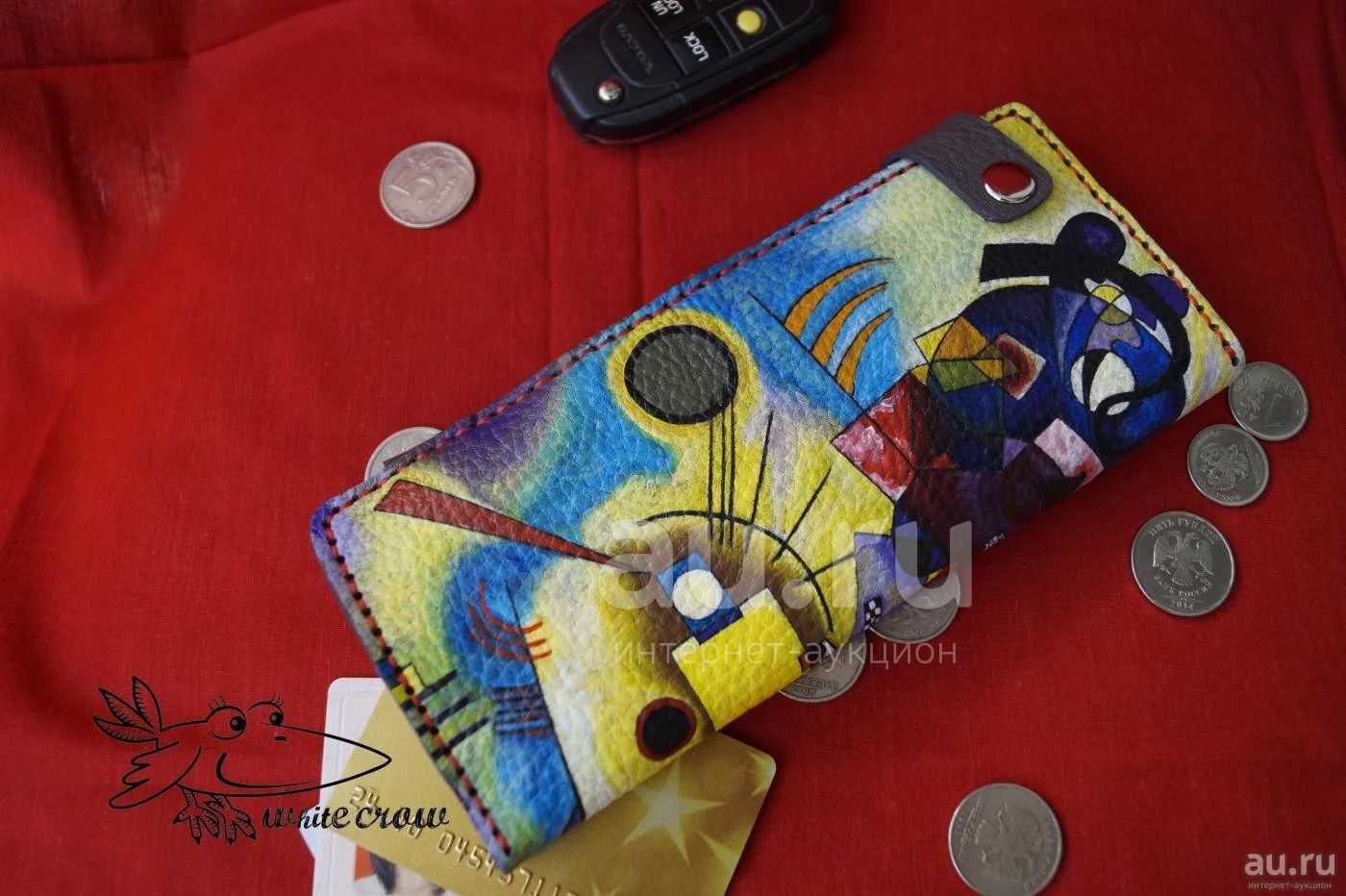 Кошелек-книжка по мотивам работ В. Кандинского "Красно-желто-синий" Натуральная кожа, ручная роспись, ручной шов. Размер в закрытом состоянии 20*10. Цвет и рисунок может меняться по выбору заказчика.