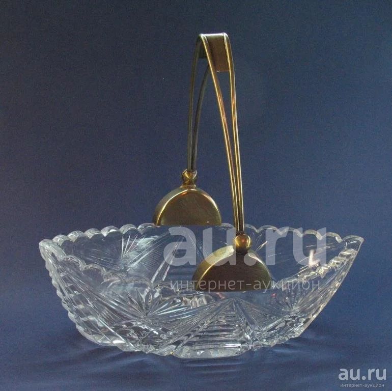 Конфетница ладья, хрусталь с серебряной ручкой, серебро 875 проба, позолота, СССР 1958 год