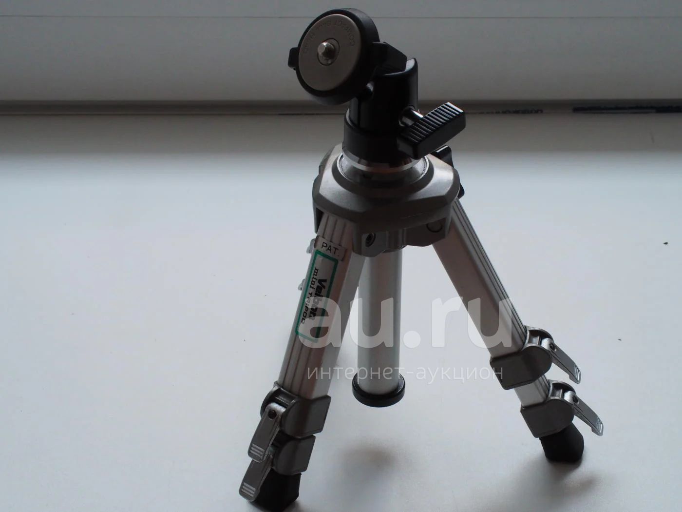 Cделан в Японии. Состояние хорошее. Есть мелкие потертости. Выглядит довольно прочным, почти все детали, основные соединения и зажимы фиксации секций ( а их 3 ) металлические ( алюминий ). Поэтому легко "примет на борт" камеру весом до 3,5 кг. Длина в сложенном состоянии 21,5 см, максимальная длина в разложенном состоянии с поднятой центральной штангой 43 см. Довольно удобная шаровая головка. Вес 500г. Вполне заменит в путешествиях "большой" штатив.