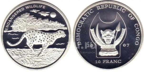 Конго 10 франков 2007 года. Гепард. Кроновый размер. Новая. В капсуле.