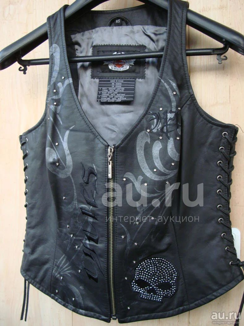 Женский байкерский кожаный жилет для Harley Davidson, размер XS (регулируется по размеру и объёму груди боковой шнуровкой. Ограниченная коллекция ноября 2008 года, относится к винтажным (не был в употреблении). Отделка вышивкой, росписью серебром по коже, аппликациями с чёрными стразами (черепа), стразами в металлической оправе. В металлическую "собачку" замка также вделана страза. По бокам шнуровка. Товар новый, куплен в специализированном магазине в США, оригинальный, производства Китая только для США, для Harley Davidson (по лицензии, выданной Harley Davidson), кожа высшего качества. Товар в наличии во Владивостоке. Также смотрите другие мои лоты: au.ru/user/Chopper-style/