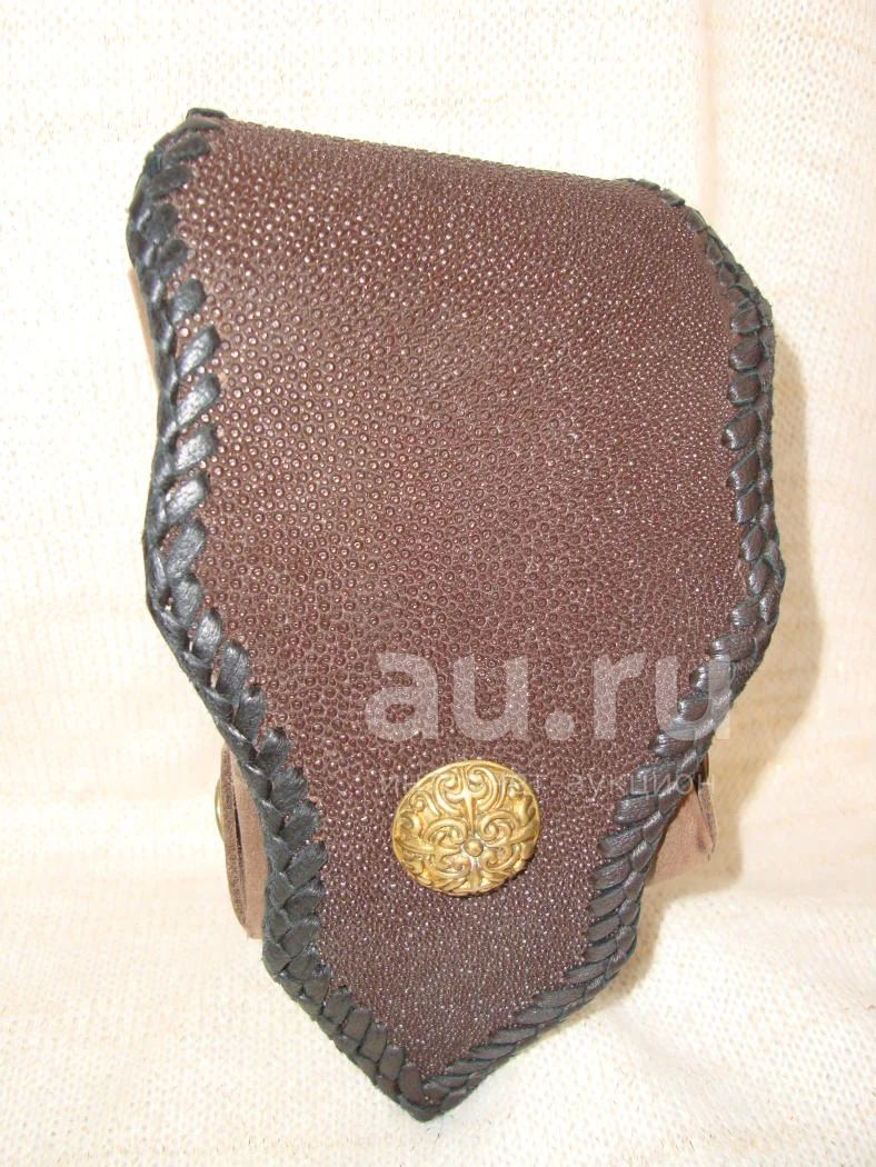 Байкерская поясная сумочка под телефон, или пачку сигарет. Ручная работа, индивидуальный заказ, поэтому эксклюзивный товар, единственный в своём роде. Сама сумочка сделана из телячьей кожи обработки "нубук". Крепление к ремню и клапан (крышка) сумочки из кожи ската. Цвет коричневый. Латунные кнопки. Кнопка на клапане задекорирована блестящей объёмной пуговицей с национальным мексиканским узором. Швы и край клапана сумочки красиво оплетены чёрной кожей. Сама сумочка коричневого цвета, кожа ската тёмно-коричневого цвета. Ширина сумочки 7,5 см, высота 11см, толщина около 3 см. Товар новый, производства США, находится в наличии во Владивостоке. Также смотрите множество товаров для байкеров в моей базе объявлений: au.ru/user/Chopper-style/