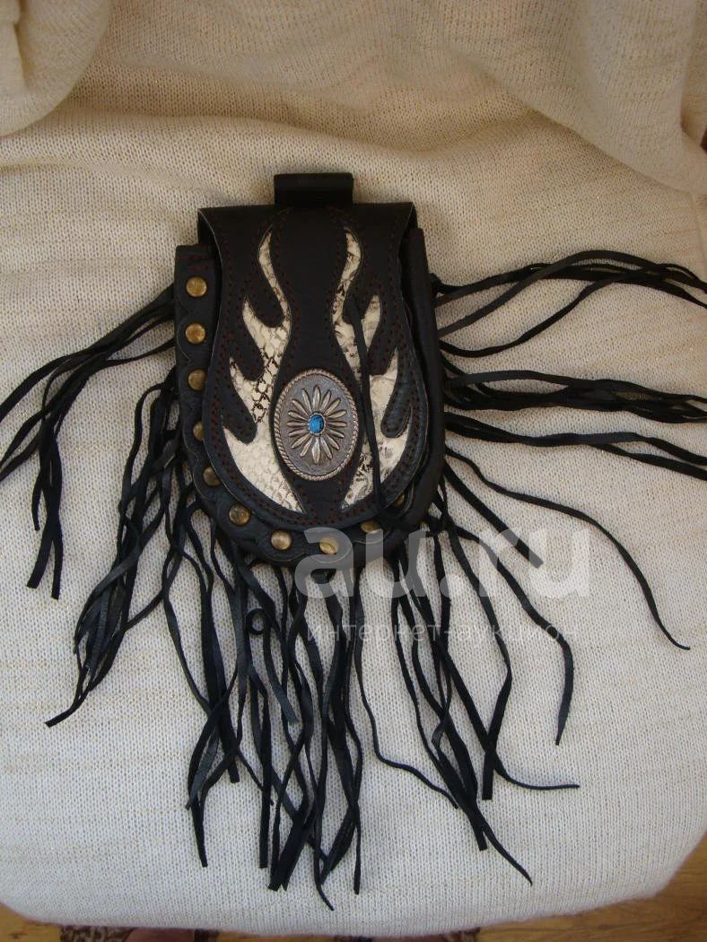 Удобная байкерская поясная сумка среднего размера под смартфон, документы, ключи и т.п. Сумка выполнена из толстой, но эластичной телячьей кожи чёрного цвета. Передняя фестончатая часть крепится к боковой части с помощью многочисленных латунных клёпок. Магнитная застёжка клапана также латунная. По боковому шву сумки обрамление в виде густой кожаной бахромы. С оборотной стороны широкая петля для фиксации сумки на поясном ремне. Внутри одно отделение. Лицевая часть сумки (клапан) украшена узором со вставкой из бриллиантового королевского питона светлых оттенков, а также этническим металлическим украшением со вставкой из бирюзы. Размер сумки: высота 16 см, толщина примерно 4,5 см, максимальная ширина 11,5 см. Ручная работа. Производство США, товар привезён из Японии, находится в наличии во Владивостоке. Также смотрите другие мои лоты: au.ru/user/Chopper-style/