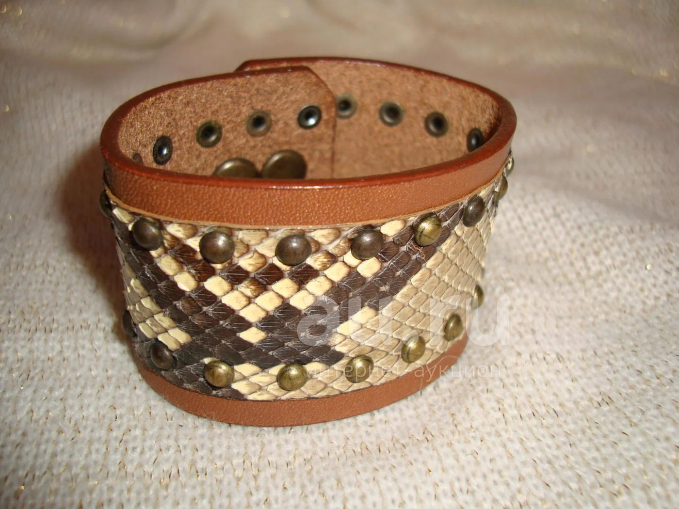 Оригинальный байкерский браслет, подходит на худенькую женскую руку. Кожа змеи пластиной приклёпана к основанию браслета с помощью латунных заклёпок. Размер браслета регулируется кнопками. Ручная работа. Товар новый, производства США, куплен в Японии, находится в наличии во Владивостоке. Также смотрите множество товаров для байкеров в моей базе объявлений: au.ru/user/Chopper-style/