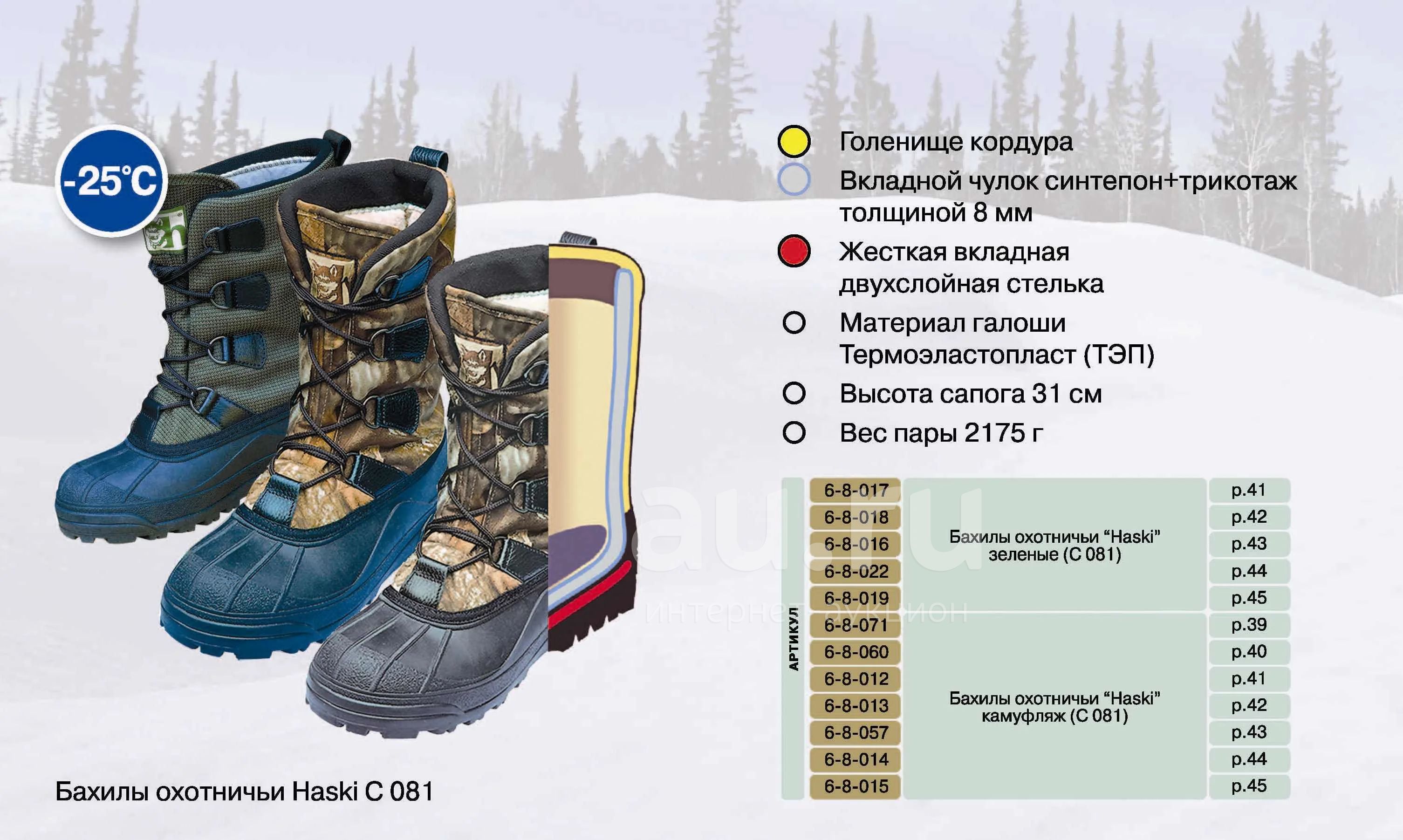Описание: Теплые и легкие, разработаны специально для длительной ходьбы по лесу Цвет изделия: КАМУФЛЯЖ Упаковка: ИНДИВИДУАЛЬНАЯ КОРОБКА И ГРУППОВАЯ УПАКОВКА ПО 5 ПАР. (Одного размера) Высота: 31 СМ Материал изделия: КАРДУРА, ПОРОЛОН, ТРИКОТАЖ, НАТУРАЛЬНАЯ КОЖА, ТЕРМОЭЛАСТОПЛАСТ Дополнительная информация: Укороченное голенище с языком изготовлено из триплированного водоотталкивающего материала (КОРДУРА, ПОРОЛОН, ТРИКОТАЖ) и натуральной кожи. Вкладной двухслойный утепляющий чулок с разрезом впереди. Специальная система шнуровки плотно фиксирует голенище по ноге. Нижняя часть сапога из термопласта, сохраняющего эластичность при низких температурах. Подошва с глубоким, открытым протектором и шипами против скольжения. Вкладная жесткая двухслойная стелька: 1 слой - каркасный материал; 2 слой - нетканый материал, сохраняющий тепло. Вкладной чулок 1 внешний слой - трикотажное полотно предохраняет поверхность чулка от истирания 2,3,4 - нетканое полотно с алюминиевой фольгой. Алюминиевая фольга отражает тепло во внутрь и создает эффект термоса. Нетканое полотно состоит из шерсти и льна, поэтому материал поглощает влагу и сохраняет тепло.