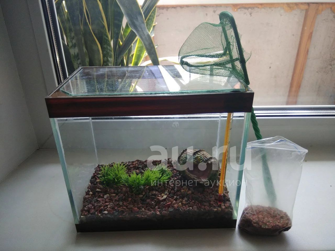 Аквариум, грунт, искусственные растения, бочка, сачок, немного корма.