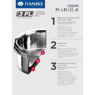 Кастрюля нержавеющая сталь, 4.7 л, крышка стекло, Daniks, Manola, CW-T078-22, индукция
